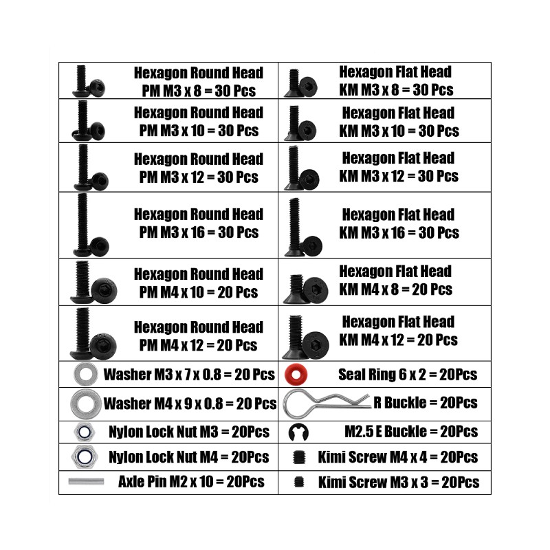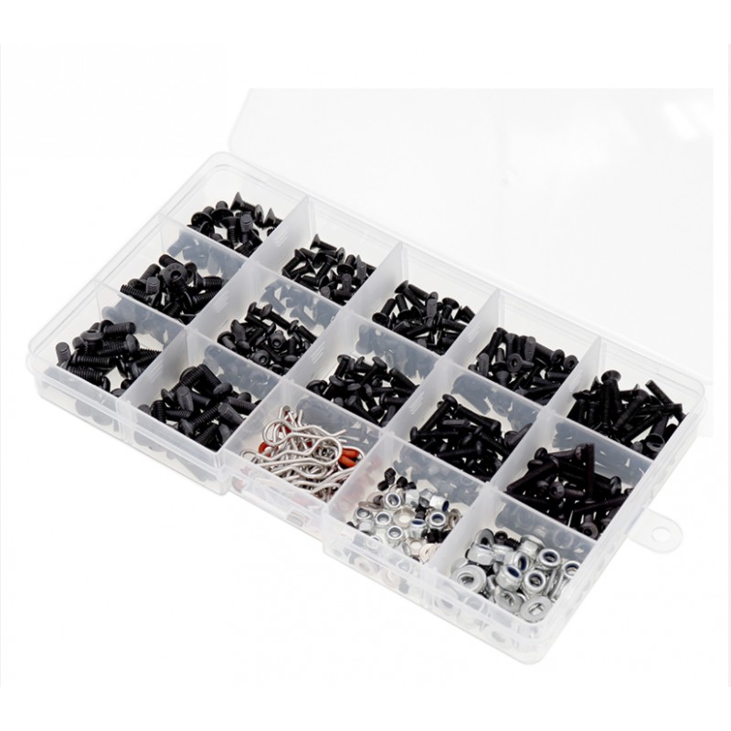 Contiene una variedad de tamaños de tornillos , arandelas y vienen en un cajita reutilizable de plástico.