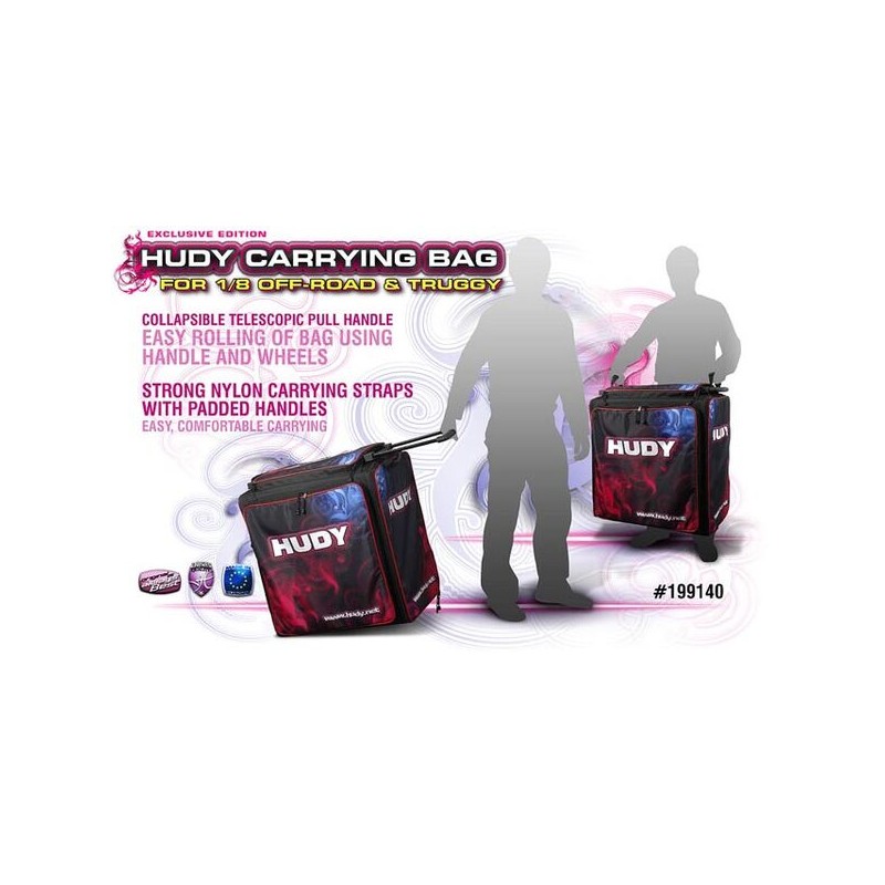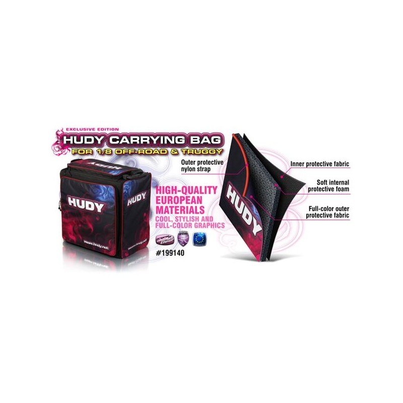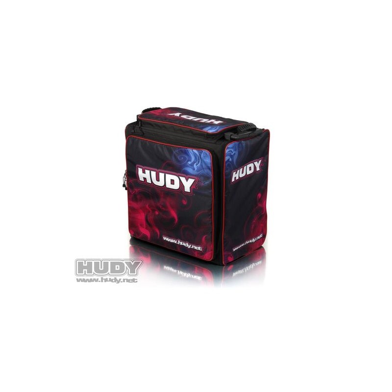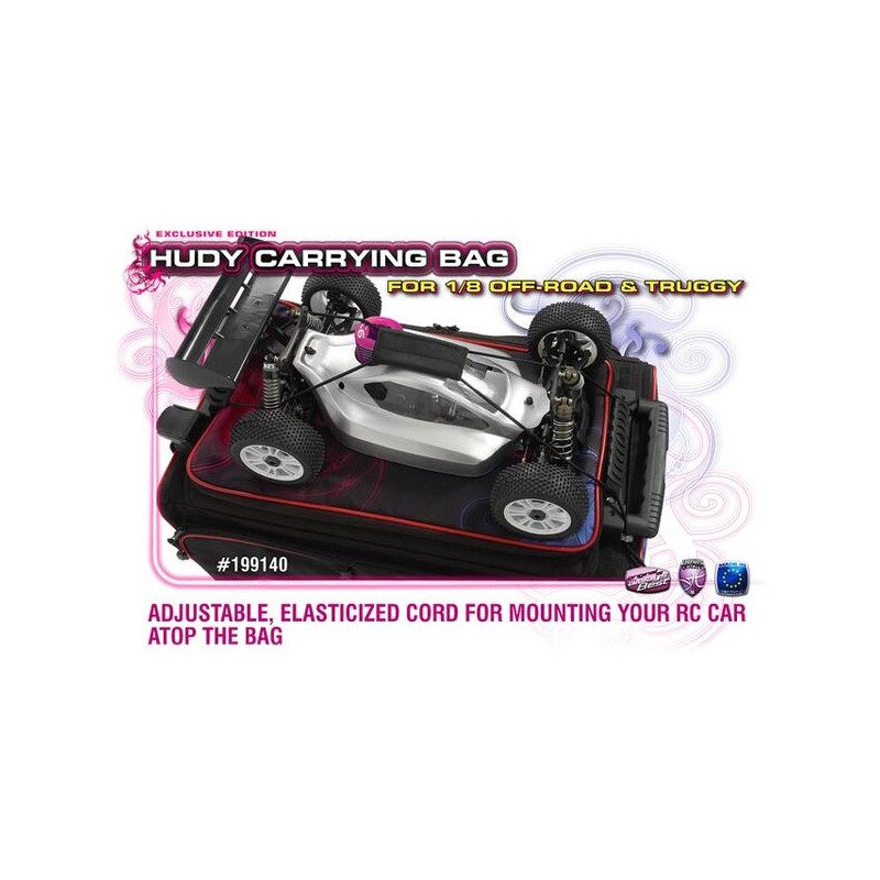 HUDY y/o la Bolsa de Caja de Inicio HUDY. Se incluye un cordón elástico para que puedas montar tu coche RC encima de la bolsa.