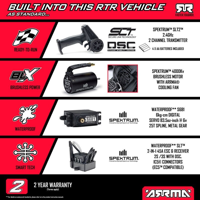 ¿Le preocupa meterse en problemas? No lo esté. La radio Spektrum SLT2 incluida incorpora un limitador de aceleración que le permite domar los temblores. Con sólo pulsar un interruptor, ajuste su velocidad máxima al 50%, 75% o 100%, de modo que tanto si está enseñando a la próxima generación como si sólo está ganando confianza, podrá mantener las cosas bajo control hasta que esté listo para desatar el caos.