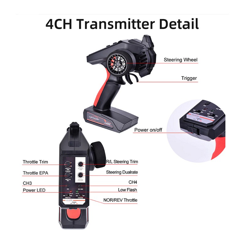 Este producto está especialmente desarrollado para coches y barcos de control remoto. Posee capacidades antiinterferencias súper activas y pasivas, muy bajo consumo de energía y alta sensibilidad de recepción. Función especial de límite de velocidad. Deja que los principiantes puedan controlar el coche dentro del rango de velocidad limitado. ¡Tiene un interruptor de límite de acelerador especial!