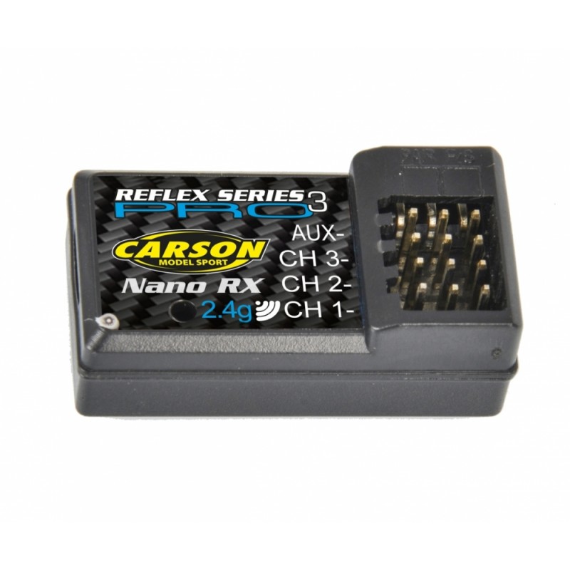 El pequeño receptor CARSON NANO de 3 canales para todas las unidades RC Reflex 2.4G PRO 3 y Reflex Stick 2 y Multi PRO (no para 500501004) es la opción ideal cuando no hay suficiente espacio en su modelo de vehículo o barco para montarlo en el RC. unidad.