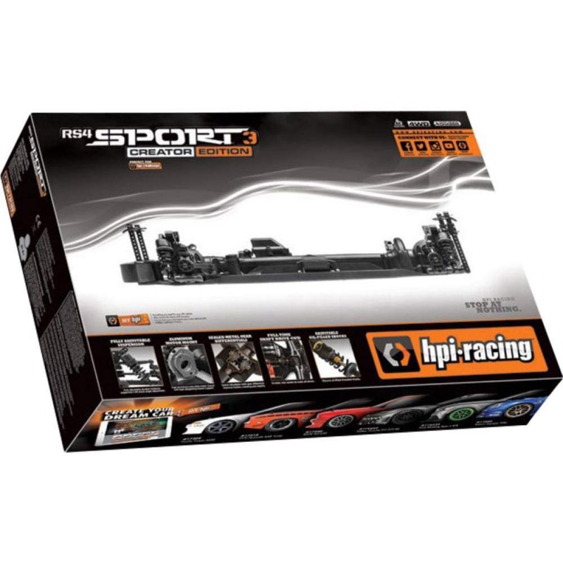 El RS4 Sport 3 Creator Edition es el primer automóvil de carreras HPI que ofrece un chasis completamente construido y listo para conducir, listo para que usted agregue su propia elección de carrocería, ruedas, neumáticos y componentes electrónicos.