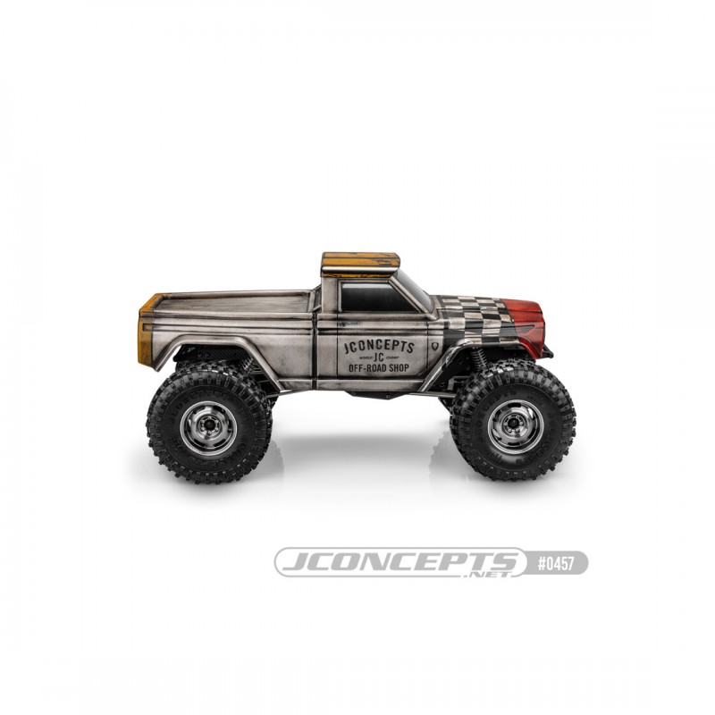 La filosofía de JConcepts para una carrocería oculta es darle la apariencia de una camioneta, añadir márgenes para una mayor articulación, un voladizo mínimo y acomodar neumáticos de competición. La carrocería de cabina simple evoca los asientos corridos, la música en el asiento trasero y la radio AM/FM a todo volumen. Las carrocerías clásicas de JConcepts se entregan transparentes, con película protectora preinstalada, incluyen una hoja de calcomanías versátil y máscaras para ventanas.
