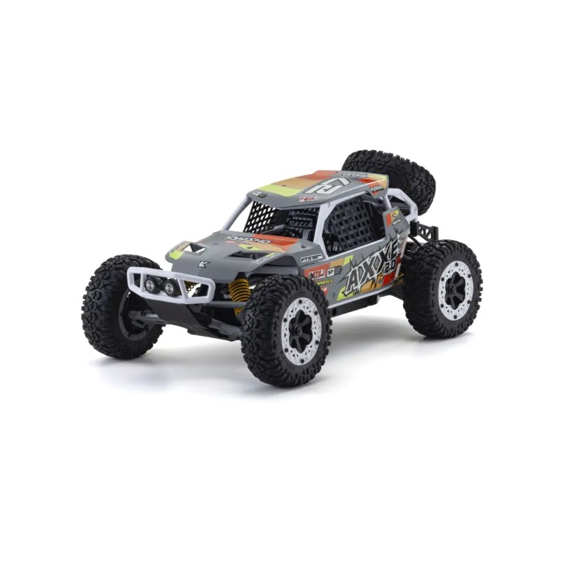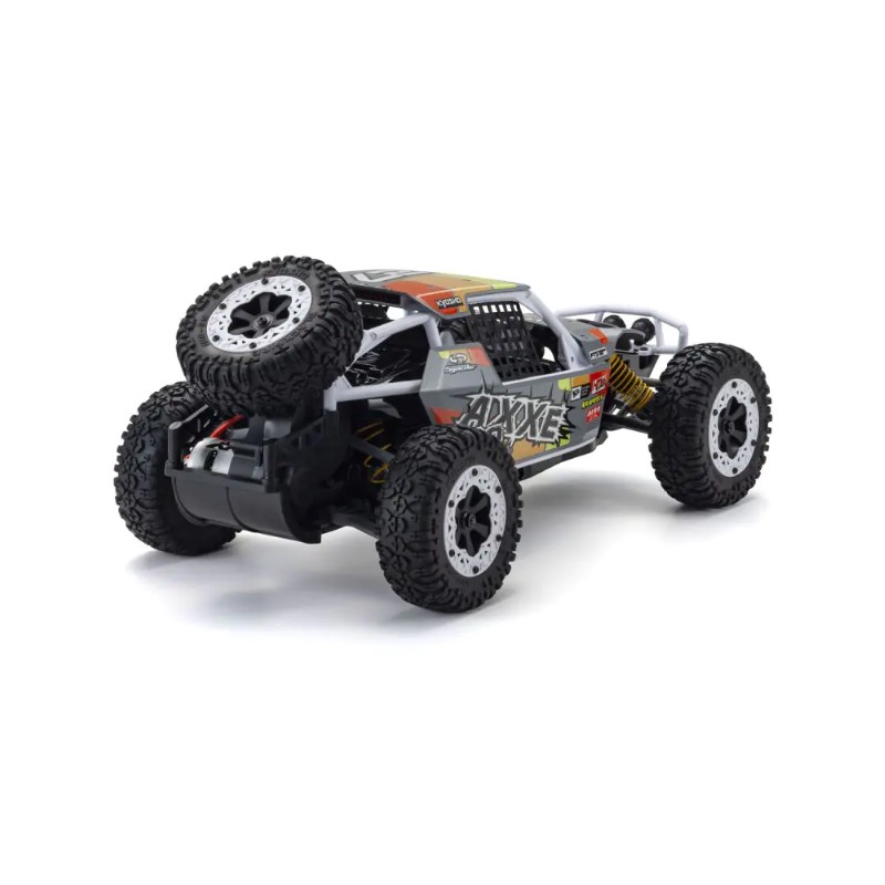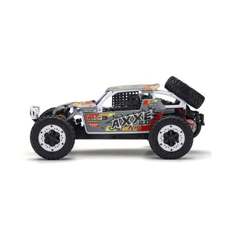 El diseño simple del buggy eléctrico (EP) de la serie EZ a escala 1/10 de Kyosho ofrece la combinación perfecta de manejo, alto rendimiento y asequibilidad. Desde su lanzamiento en 2012, el AXXE de la serie EZ ha sido un popular automóvil de radiocontrol para principiantes y también un excelente segundo automóvil para conductores más experimentados. Siguiendo su excelente diseño básico, el nuevo AXXE 2.0 ha renacido con actualizaciones en sus componentes estándar del sistema de radiocontrol y una carrocería modificada para la compatibilidad con las fuentes de energía modernas. Al igual que su modelo hermano, el Sandmaster, que se renovó en 2023, el AXXE 2.0 ha sufrido algunos cambios en el diseño de su chasis para acomodar varios tipos de baterías y reducir el contacto de la nueva caja de cambios con la superficie de la carretera. El servo de dirección también se ha actualizado a una especificación de alto par de 6 kg que puede soportar cargas pesadas de conducción todoterreno y el controlador de velocidad a prueba de agua (ESC) le permite atravesar charcos sin preocupaciones. Con un nuevo esquema de color de carrocería, el marco de tubos utilizado en los rallyes y carreras de buggies reales combina tubos blancos con elegantes paneles grises y nuevos diseños de calcomanías. ¡Elige entre dos patrones de color de carrocería diferentes de AXXE 2.0! Se vende como un Readyset que incluye carrocería y chasis preensamblado con sistema R/C instalado, todo lo que necesitas para disfrutar de la acción del auto R/C es una batería para el auto, un cargador de batería y baterías para el transmisor. La estructura de diseño simple es fácil de desmontar y volver a ensamblar, lo que es óptimo para el mantenimiento y la puesta a punto.