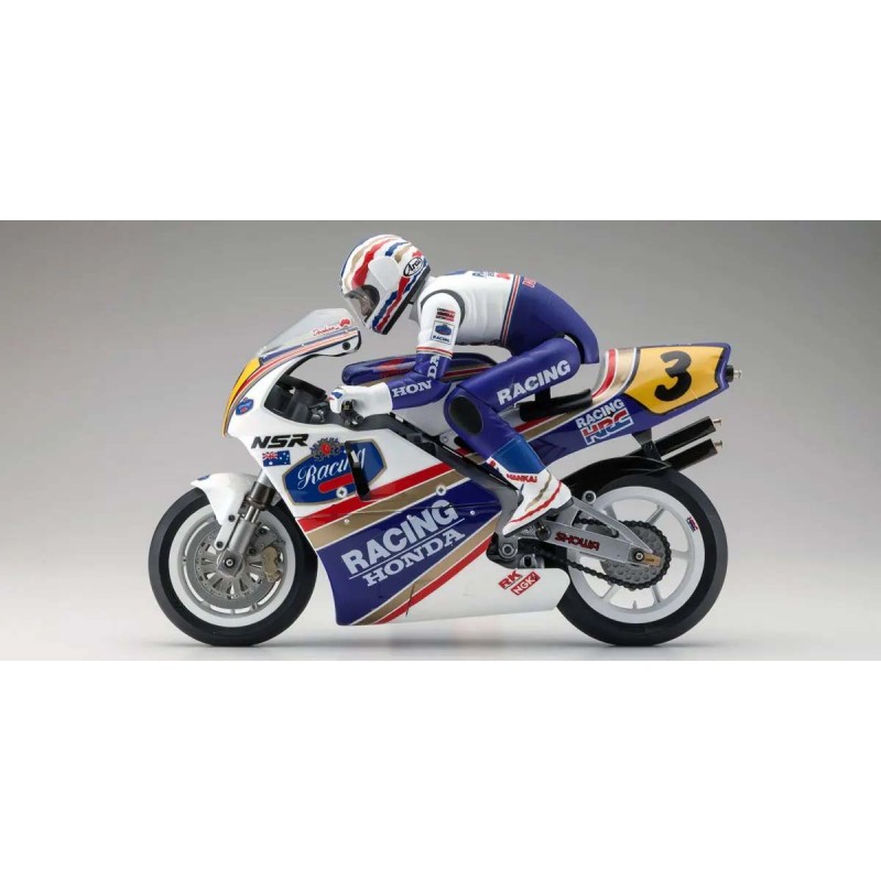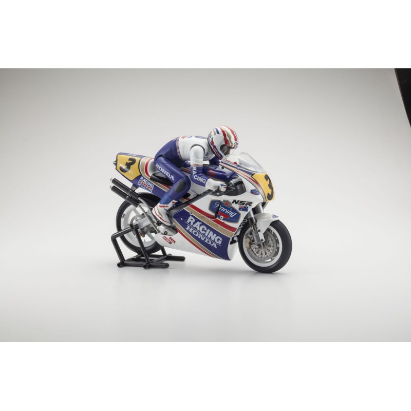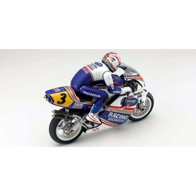 Reproduce fielmente la Honda NSR500, la máquina oficial que compitió en la categoría de 500 cc del Campeonato Mundial de Motociclismo de 1991.