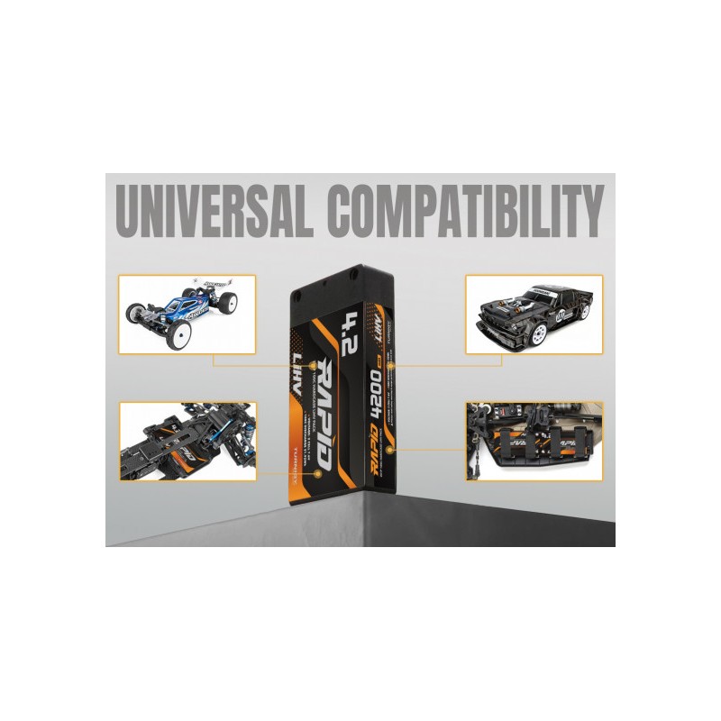 Los paquetes Turnigy Rapid utilizan cables chapados en plata y cables de equilibrio chapados en oro para minimizar la resistencia interna. Esta batería lipo se mantiene fría bajo carga y dura más. Al ser una batería 2s, proporciona energía eficiente y constante, esencial para configuraciones exigentes de baterías de coches RC.