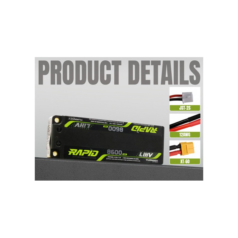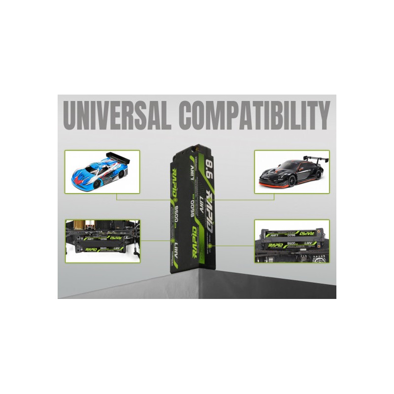 La batería de LiPo Rapid Green Hardcase es ideal para drifting, carreras de turismo y F1 a escala 1/10, así como para buggies, truggies, camiones de circuito corto y coches GT eléctricos a escala 1/8. Se adapta perfectamente a las mejores marcas de RC, como XRAY, TLR, Team Associated, Schumacher, Serpent, KYOSHO, INFINITY, YOKOMO y AWESOMATIX.