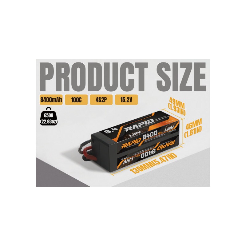 8400 mAh + 100 °C de descarga continua, 15,2 V de alto voltaje para una potencia potente. Estuche rígido con cables plateados y conectores dorados: baja resistencia, alta eficiencia, compatible con RC, ¡excelente autonomía y potencia explosiva!