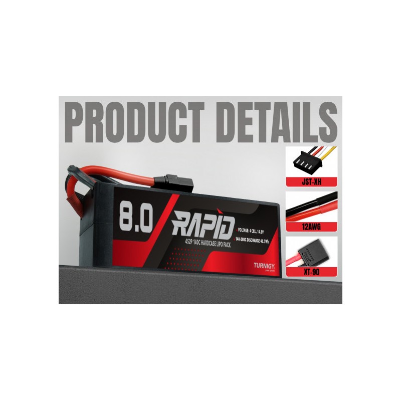 Los paquetes de baterías de LiPo Hardcase de Turnigy son reconocidos por ofrecer un excelente rendimiento y durabilidad en sus autos, camiones, botes y más vehículos RC favoritos. La gama Turnigy Rapid continúa con este pedigrí al utilizar tecnología de vanguardia para lograr un rendimiento aún mejor, una mayor vida útil y una resistencia interna aún menor que cualquiera de nuestros paquetes Hardcase hasta la fecha. ¡Estos paquetes son capaces de ofrecer una velocidad de descarga alucinante de hasta 140 °C!
