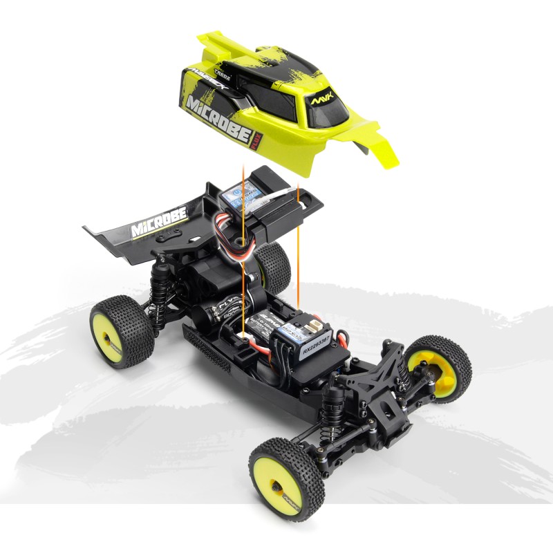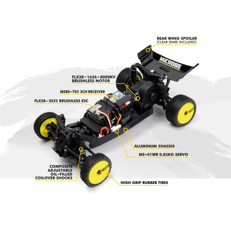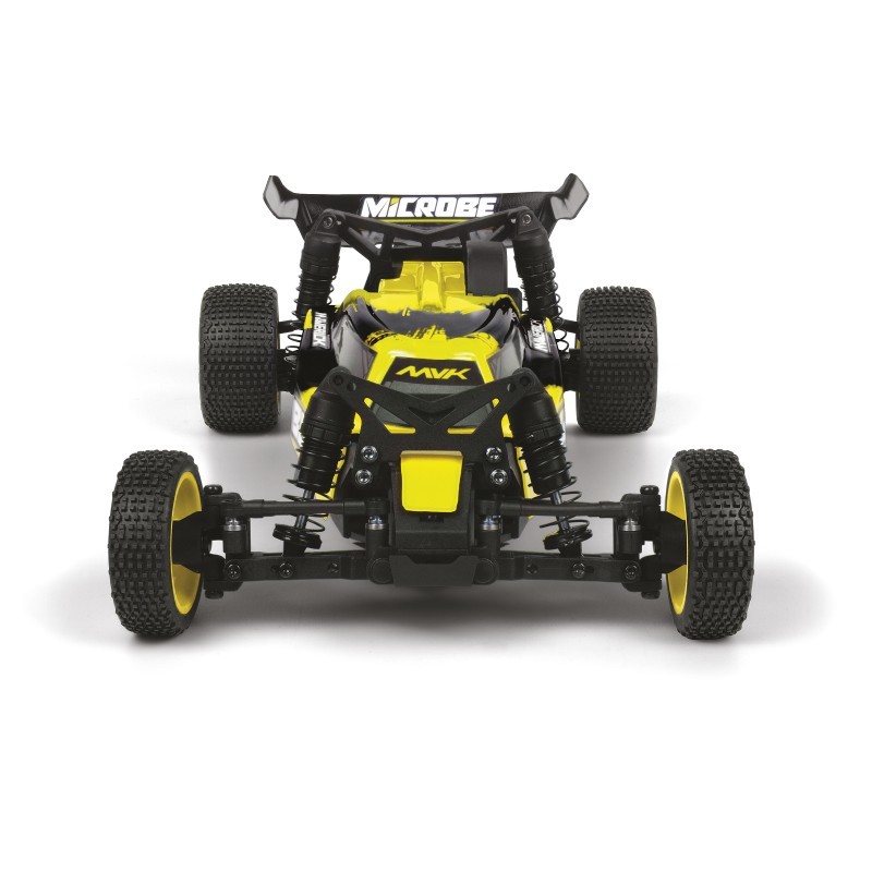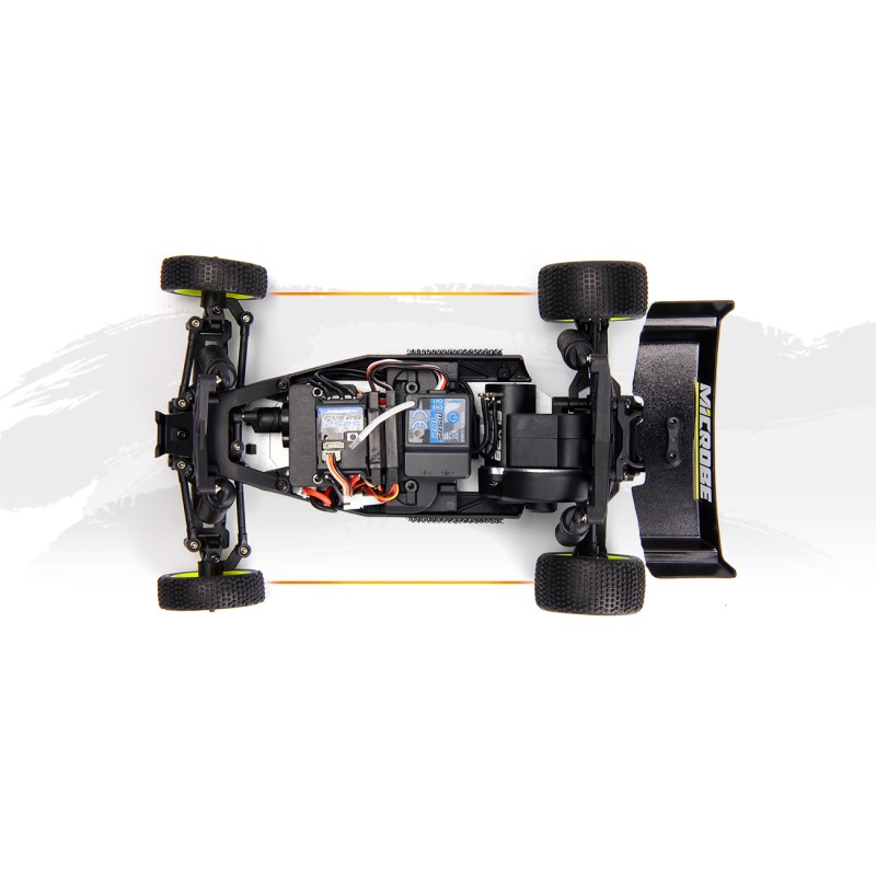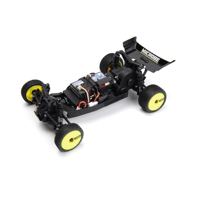 Un elegante chasis de aluminio anodizado de 1,5 mm, una transmisión totalmente con rodamientos de bolas y una suave transmisión trasera de 3 velocidades se combinan para dar al Microbe una sensación de estabilidad y precisión. Añádele amortiguadores coilover llenos de aceite y llantas ventiladas con inserciones de espuma, y tendrás un pequeño buggy al que le encanta tomar las curvas, absorber los baches y salir disparado de las curvas con confianza.