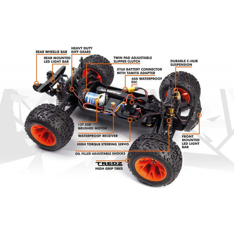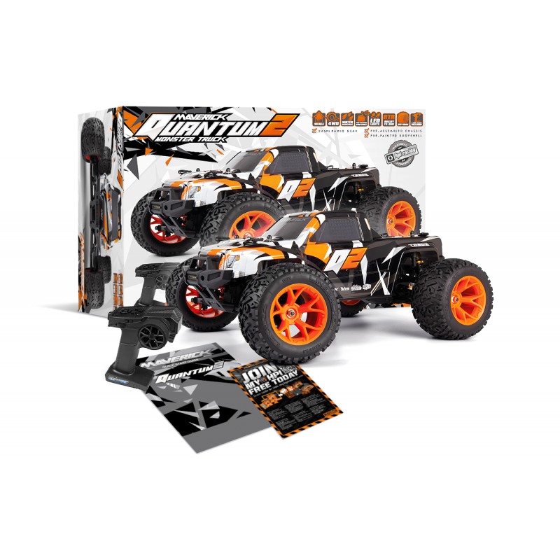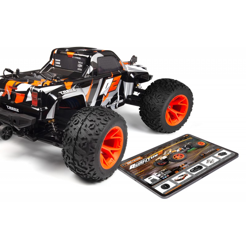 ¡Esta versión de motor cepillado de 12 vueltas y tamaño 550 está disponible en el clásico y genial AZUL Maverick con ruedas negras o en el NARANJA súper brillante con ruedas en naranja fluorescente! Cada Quantum2 MT está equipado con luces delanteras y traseras que funcionan, incluidas luces de freno funcionales, ¡y puedes encenderlas o apagarlas desde el nuevo controlador! ¡Con ruedas nuevas y neumáticos Tredz, el Quantum2 llamará la atención e impresionará instantáneamente a tus amigos!