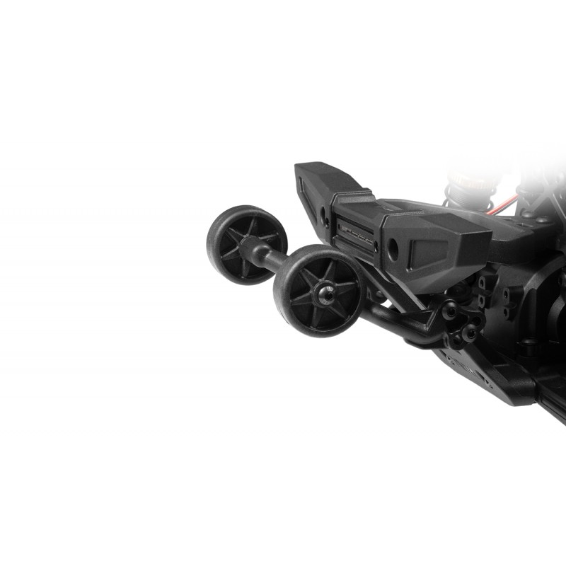 El parachoques trasero combina con el estilo del delantero y además es extragrueso para mayor protección. ¡También notarás la enorme barra con ruedas que hay allí mismo! ¡No solo tiene ruedas giratorias funcionales para ayudarte a mantener el control durante las carreras de velocidad, sino que también es ajustable! ¡Mantenlo bajo para mayor control o deja volar las ruedas delanteras para mayor estilo! Y, por supuesto, tenemos que mencionar las luces LED traseras de color rojo brillante, ¡MÁS luces de freno que funcionan, que puedes apagar y encender desde el controlador!
