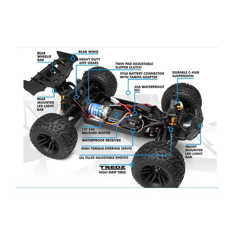 En cuanto a opciones, puede optar por esta versión con motor de escobillas de 12 vueltas y tamaño 550 en color AZUL Maverick con elegantes llantas negras, o ir a lo brillante con el color NARANJA y sus llantas a juego en naranja fluorescente. La Quantum2 XT también está equipada con luces delanteras y traseras funcionales, incluidas las luces de freno, controladas directamente desde el nuevo controlador MTX-400.