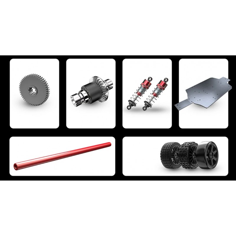 Incluye: MJX Hyper GO 14303 (RTR), transmisor de 2,4 GHz, tres juegos de neumáticos diferentes, batería de 7,4 V y 2000 mAh, cable de carga USB, herramientas y manual de usuario.