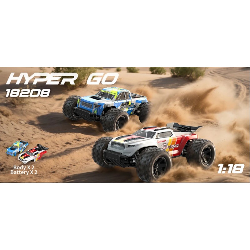 El MJX Hyper GO 18208 es un versátil camión todoterreno RC a escala 1/18 con un potente motor de escobillas, un chasis robusto y dos carrocerías atractivas. Características