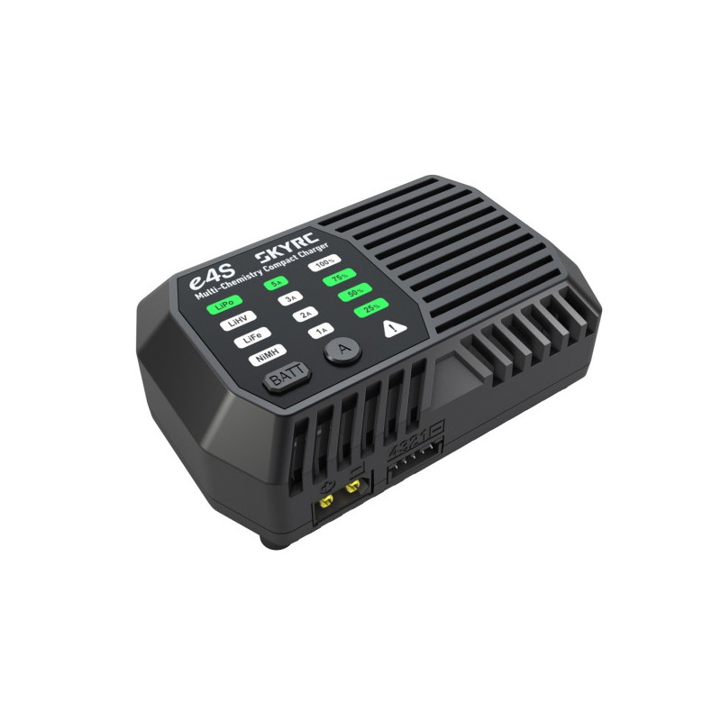 SkyRC e4S: 60W de potencia, corriente ajustable 1-5A y compatibilidad multiquímica (LiPo, LiFe, LiHV, NiMh).