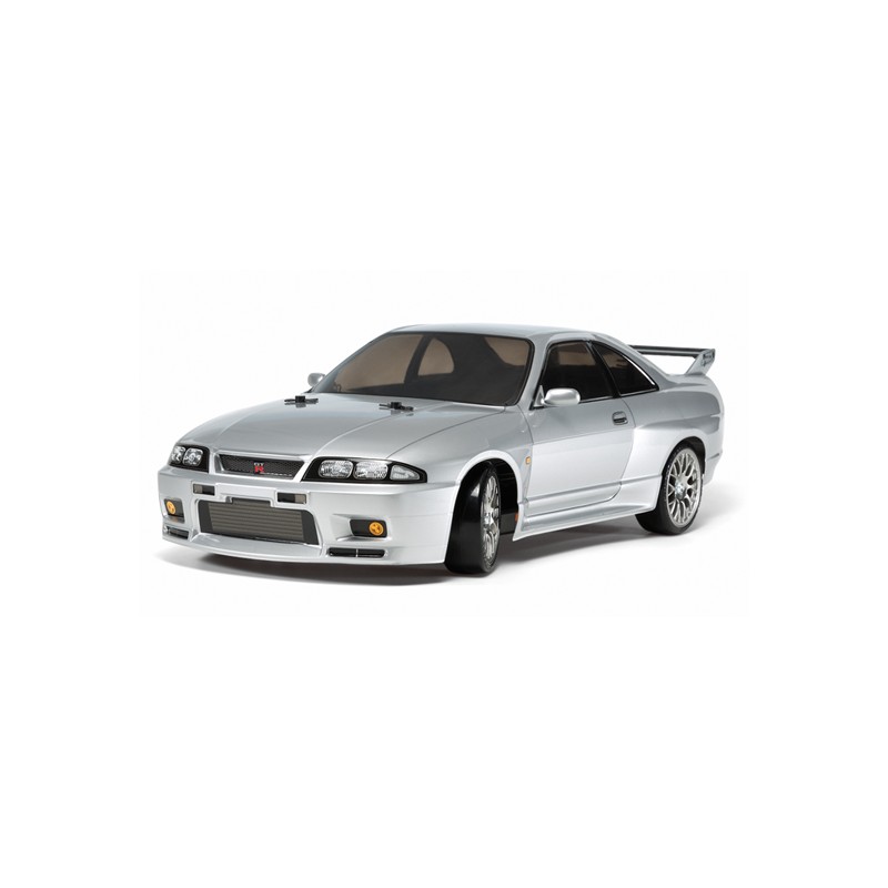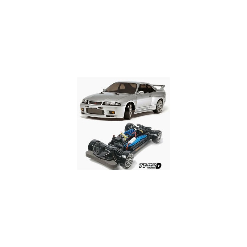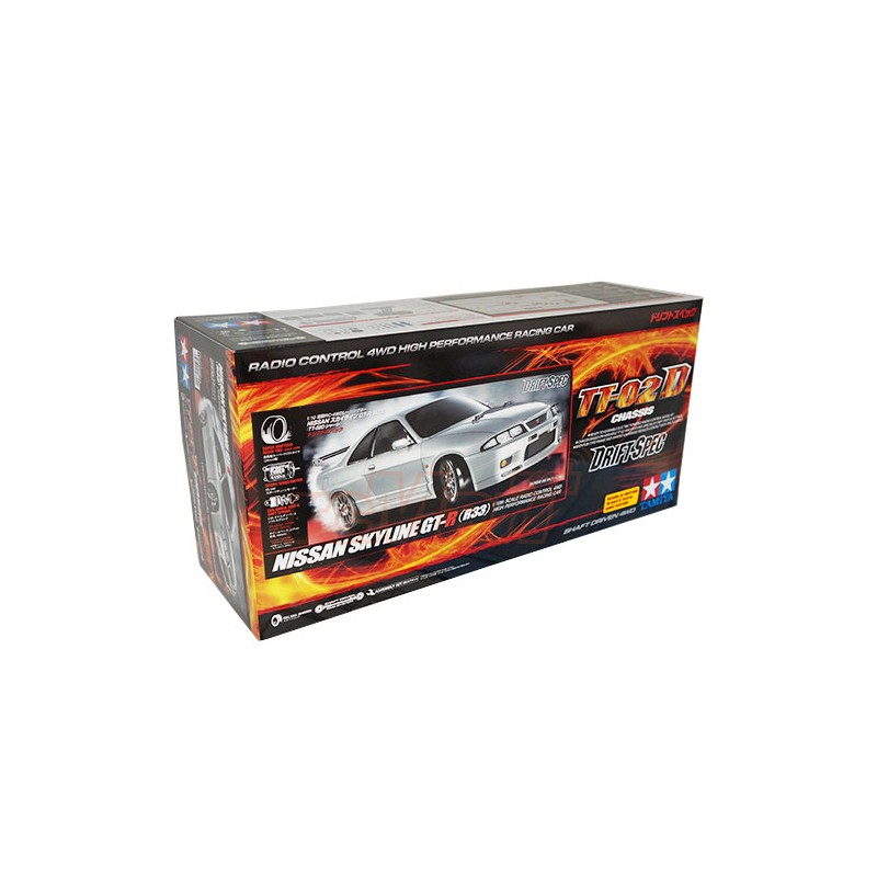 Este modelo de R/C spec deriva recrea con precisión el cuerpo del Nismo R33 GT-R. Partes del cuerpo están hechos de policarbonato resistente y ligero. El TT-02D es una versión de especificaciones drift del nivel de entrada chasis TT-02 de Tamiya. Está equipado con un motor sport tuned adaptado y numerosas piezas de especificaciones drift incluyendo amortiguadores de aceite CVA y los neumáticos súper Driftech.