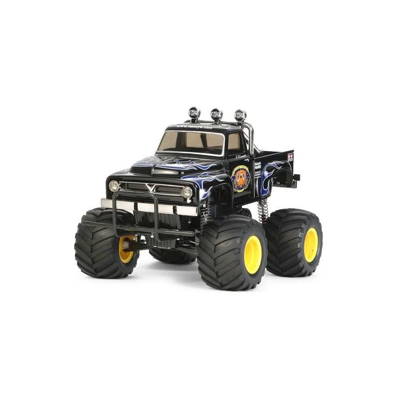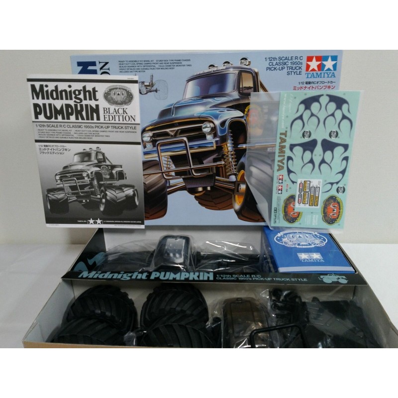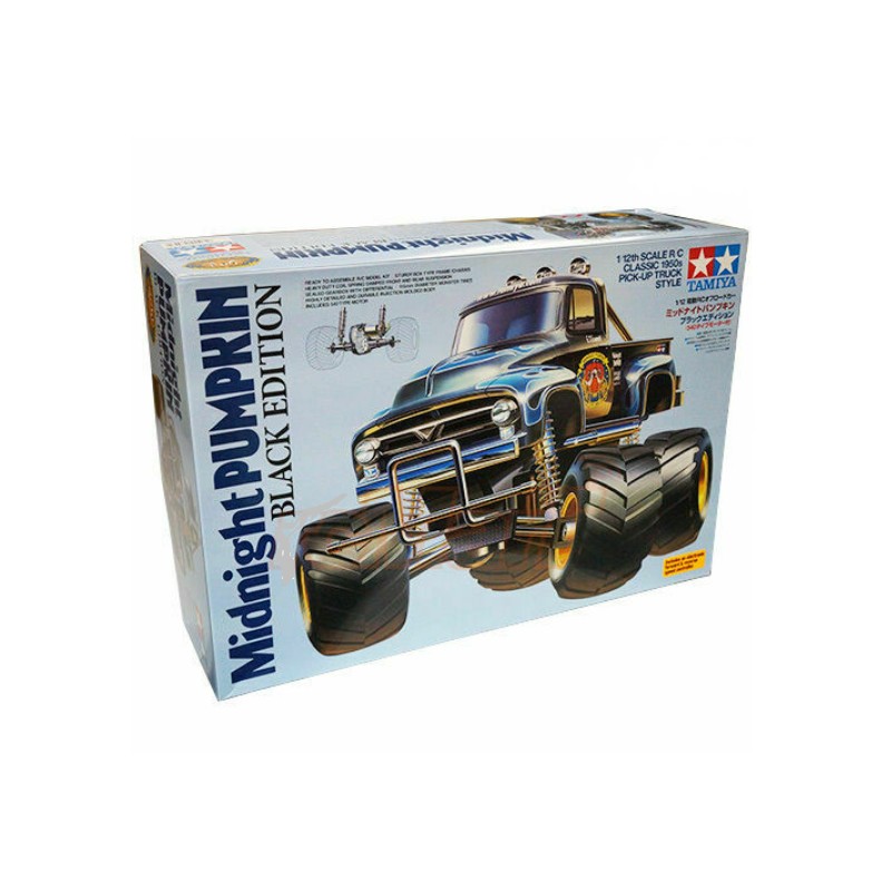 Este kit de montaje R/C a escala 1/12 de Midnight Pumpkin (lanzado por primera vez en 1987) presenta una carrocería de camioneta pick-up muy detallada que recuerda a los diseños clásicos estadounidenses de los años 50. ¿El especial? Black Edition? La carrocería viene moldeada en negro y se acentúa con la rejilla delantera chapada en metal, los guardabarros colgantes, los amortiguadores y la barra antivuelco. Todo este detalle se encuentra encima de grandes neumáticos de 115 mm de diámetro.