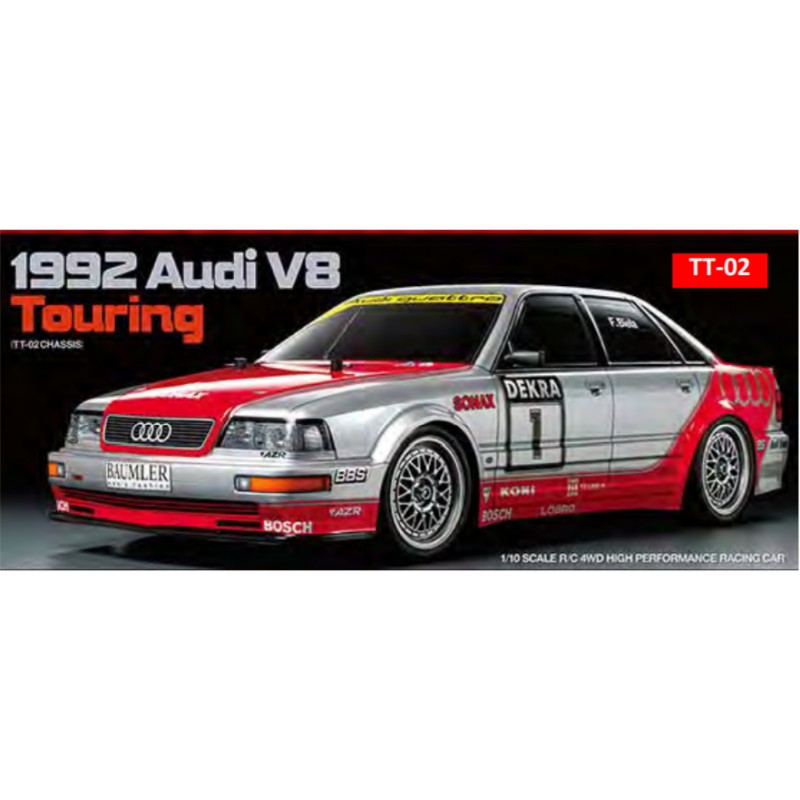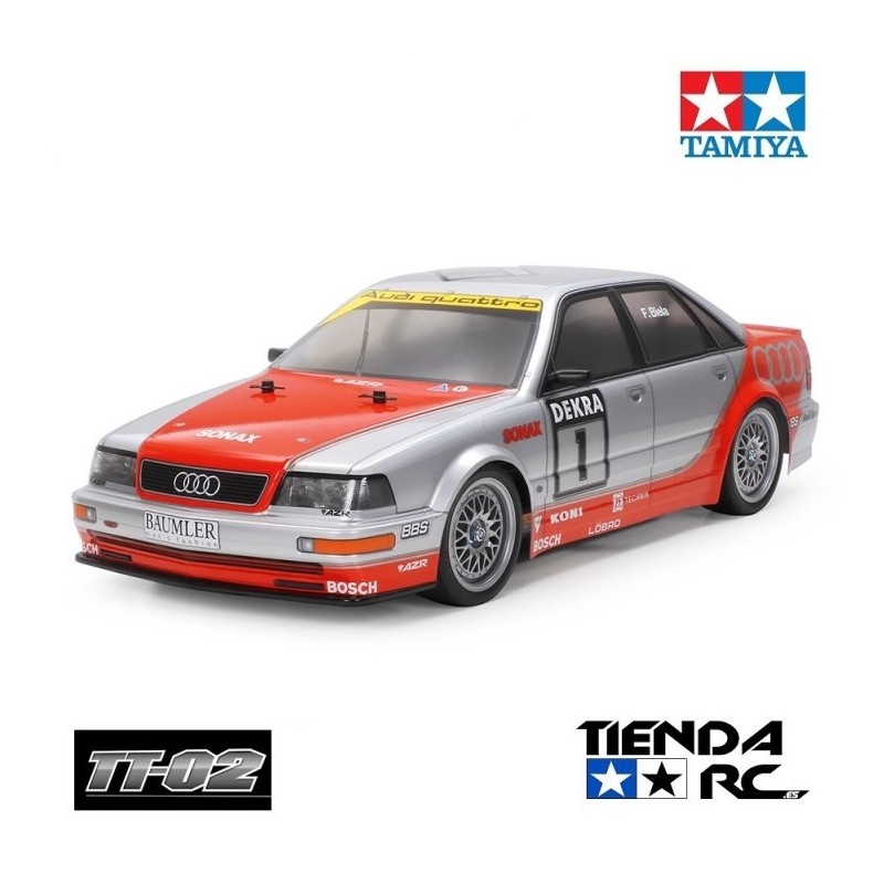 Este coche de carreras en pista con un motor V8 de 3,6 litros se caracterizaba por su transmisión Quattro y su imponente carrocería. Este último ha sido reproducido maravillosamente por Tamiya en este modelo RC basado en el chasis del TT-02.