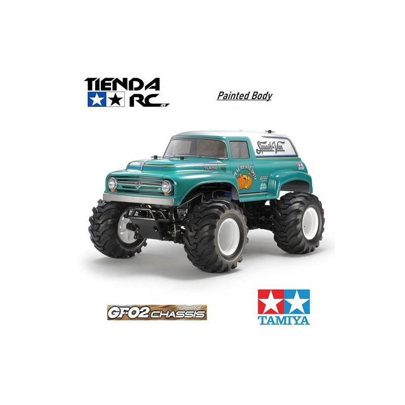 El Squash Van es un vehículo de neumáticos grandes divertido de conducir inspirado en las furgonetas americanas de los años 50. La carrocería de policarbonato se asienta sobre el nuevo chasis 4WD GF-02 accionado por engranajes, que es una variante del cómico GF-01. Mientras que el chasis del GF-01 presenta un diseño cómico, el chasis del GF-02 emplea una distancia entre ejes más realista y un marco con motivos de escaleras y tuberías.