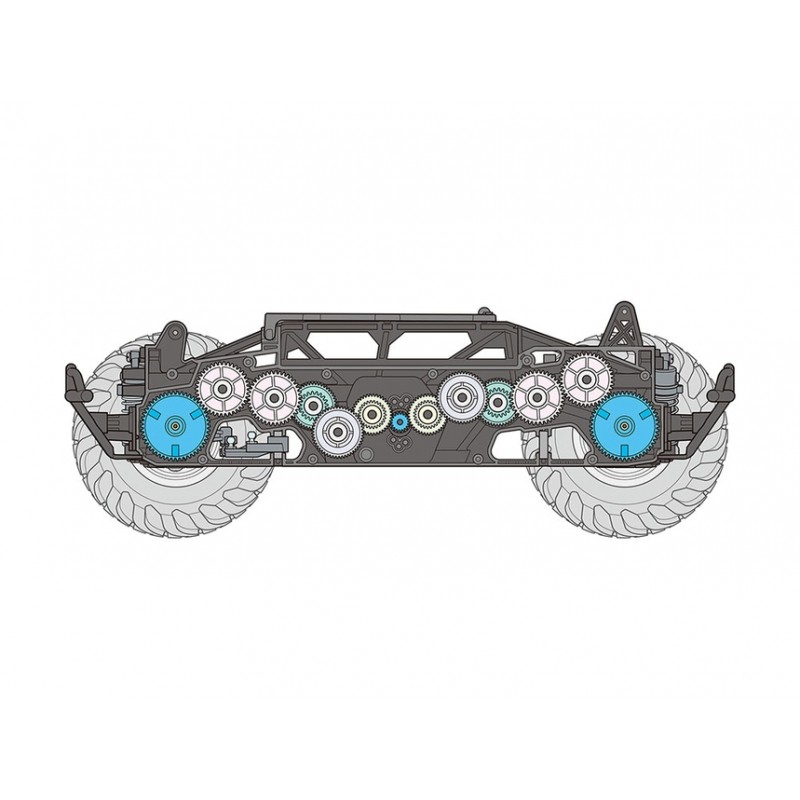 El chasis GF-02 4WD impulsado por engranajes presenta su motor en una posición baja y central en el marco monocasco liviano y duradero, y transmite potencia a la parte delantera y trasera a través de engranajes. La larga distancia entre ejes y la amplia configuración de la banda de rodadura garantizan un rendimiento todoterreno estable. El marco delgado presenta motivos de escaleras/tuberías y cuenta con cajas de engranajes selladas integradas que ayudan a mantener las piedras alejadas. Los diferenciales de engranajes delantero y trasero permiten tomar curvas con suavidad, mientras que los engranajes de piñón vendidos por separado ofrecen una opción entre tres tipos de relaciones de transmisión, y un protector del motor mejora la confiabilidad todoterreno. La suspensión de doble horquilla en las 4 ruedas emplea cuatro amortiguadores de fricción y el servo de dirección está situado a la izquierda con tirantes de idéntica longitud.